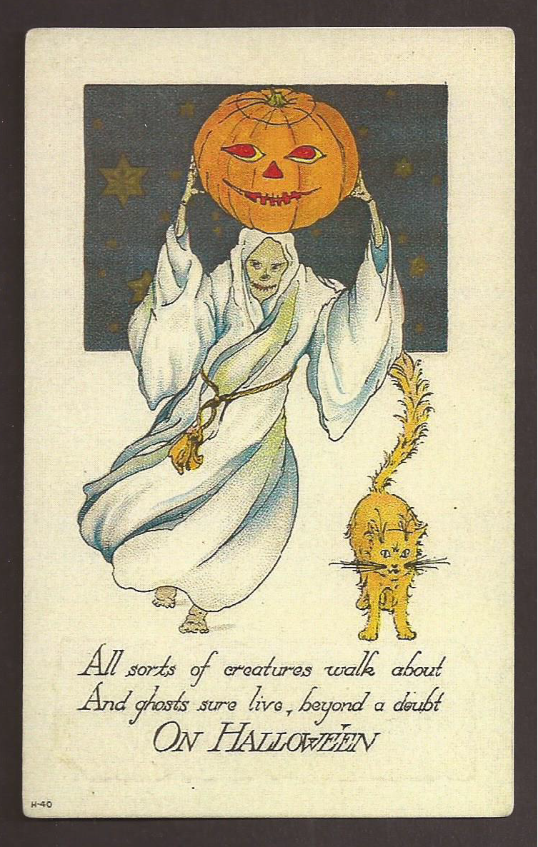 Title (ebay affiliate link): Halloween, Skeleton, Pumpkin and Cat, Postcard, Carte Postale