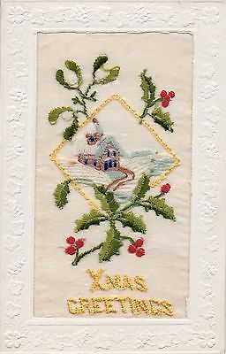 XMAS GREETINGS: WINTER SCENE: WW1 EMBROIDERED SILK POSTCARD
