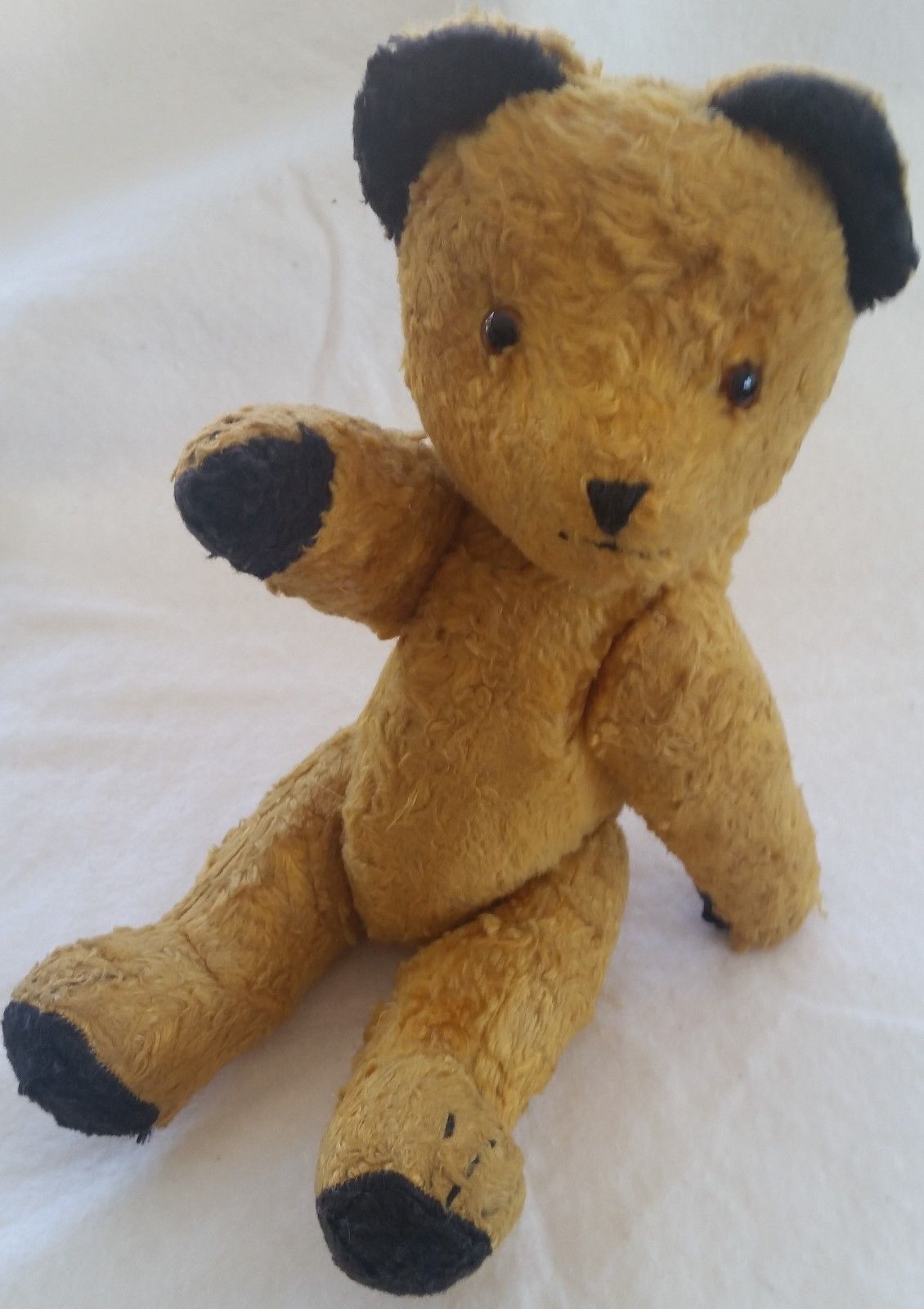 Title (ebay affiliate link): Vintage 1950 Sooty Bear Articulated Mohair Golden Yellow Straw Filled Teddy 14"