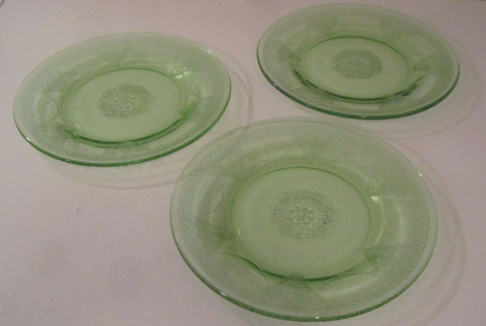 Set of 3, 8 1/2" Green Depression Glass Plates