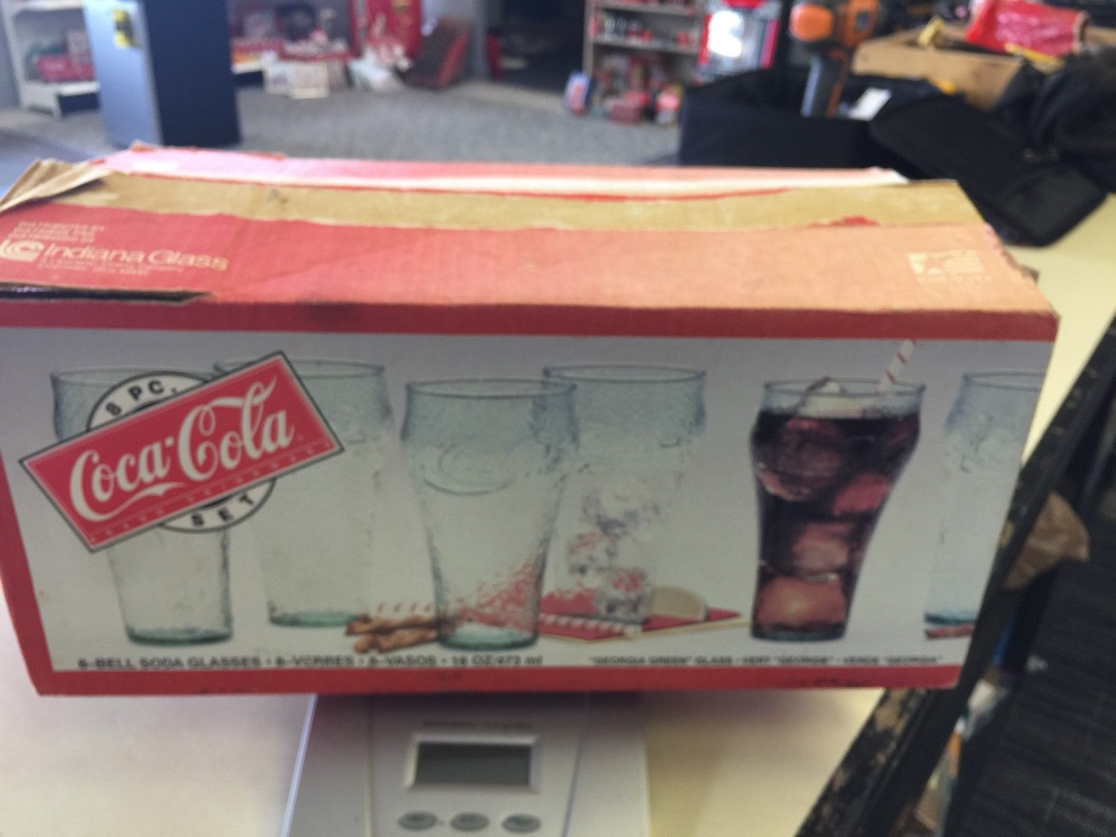 1995 Coca Cola Coke Set 8 Bell Glasses 16 oz Georgia Green Glass Indiana Glass