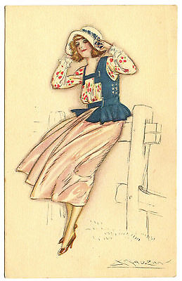 Postcard Artist-signed: Mauzan - Pretty Girl leaning on a Fence
