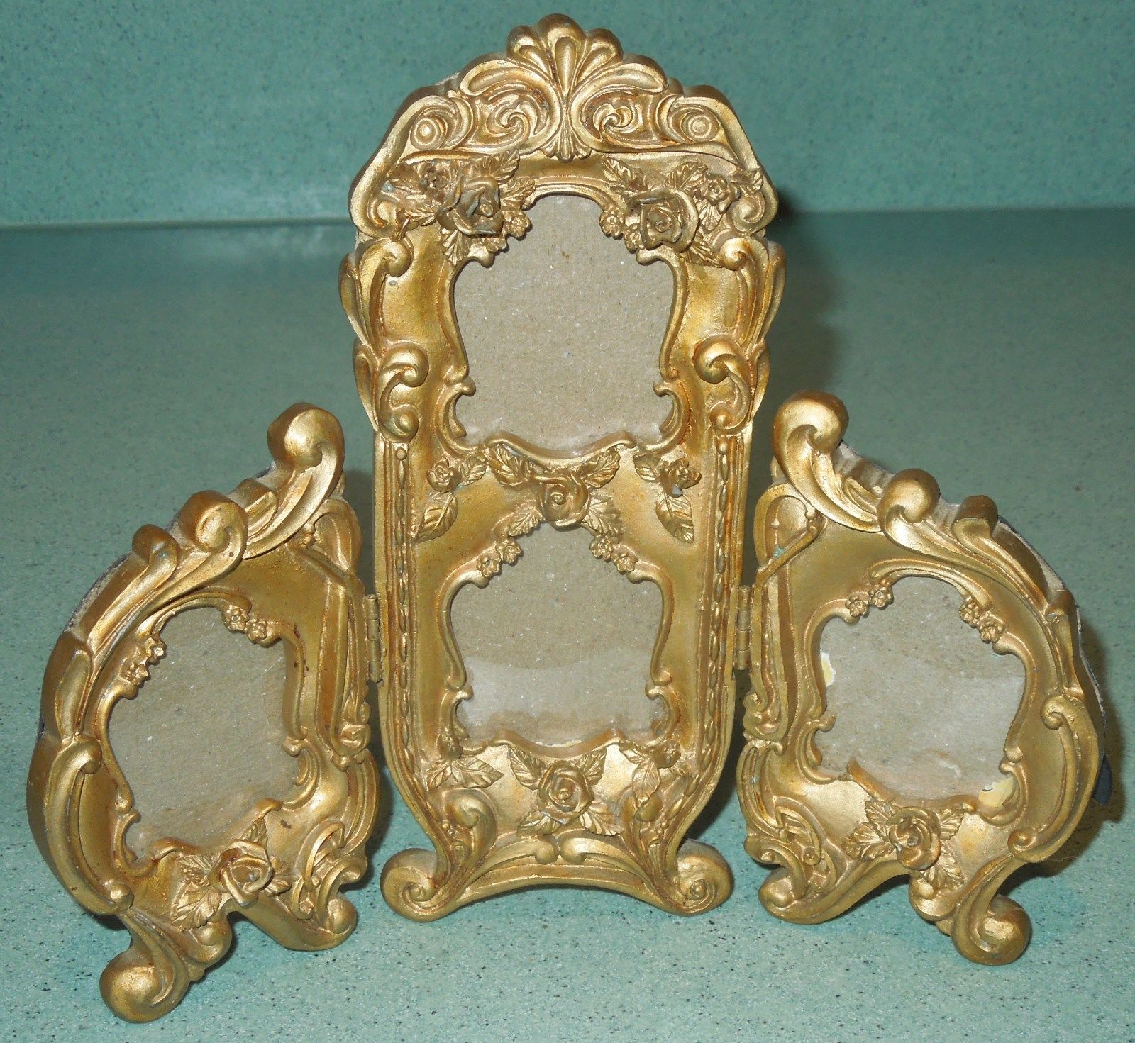Nouveau style picture frame ornate tri-folding , holds four MINIATURE pictures