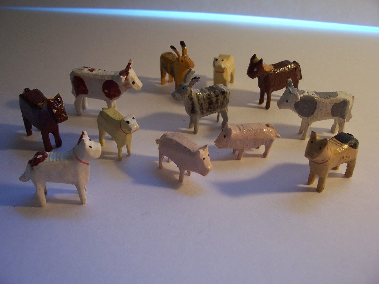 Title (ebay affiliate link): 12 Antique Painted CARVED WOOD Miniature ANIMALS - Goat~Dog~Horse - No Damage