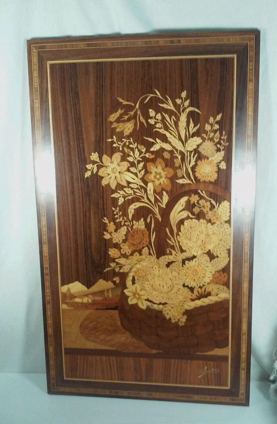 VINTAGE ITALY SIGNED SCULU LARGE INLAID MARQUETRY WOOD WALL HANGING