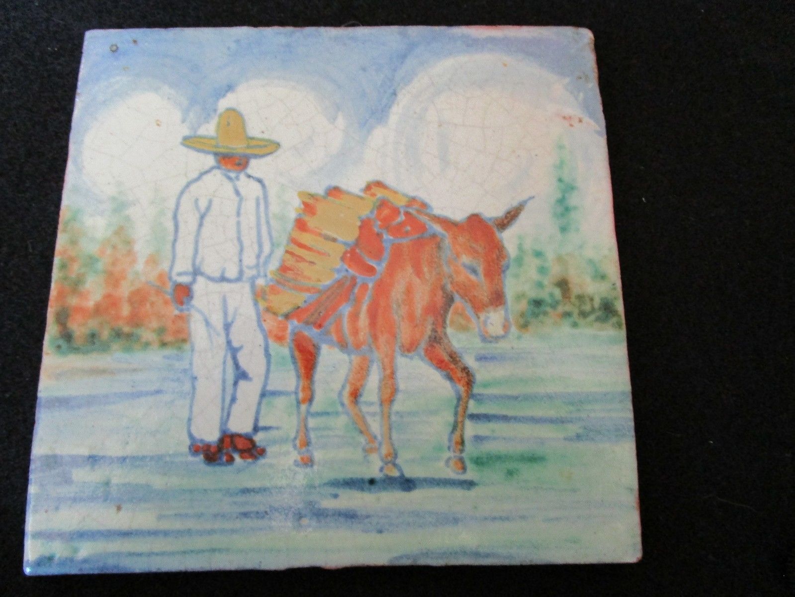 VINTAGE MEXICAN SCENIC TILE MAN AND DONKEY 5 1/2" SQUARE