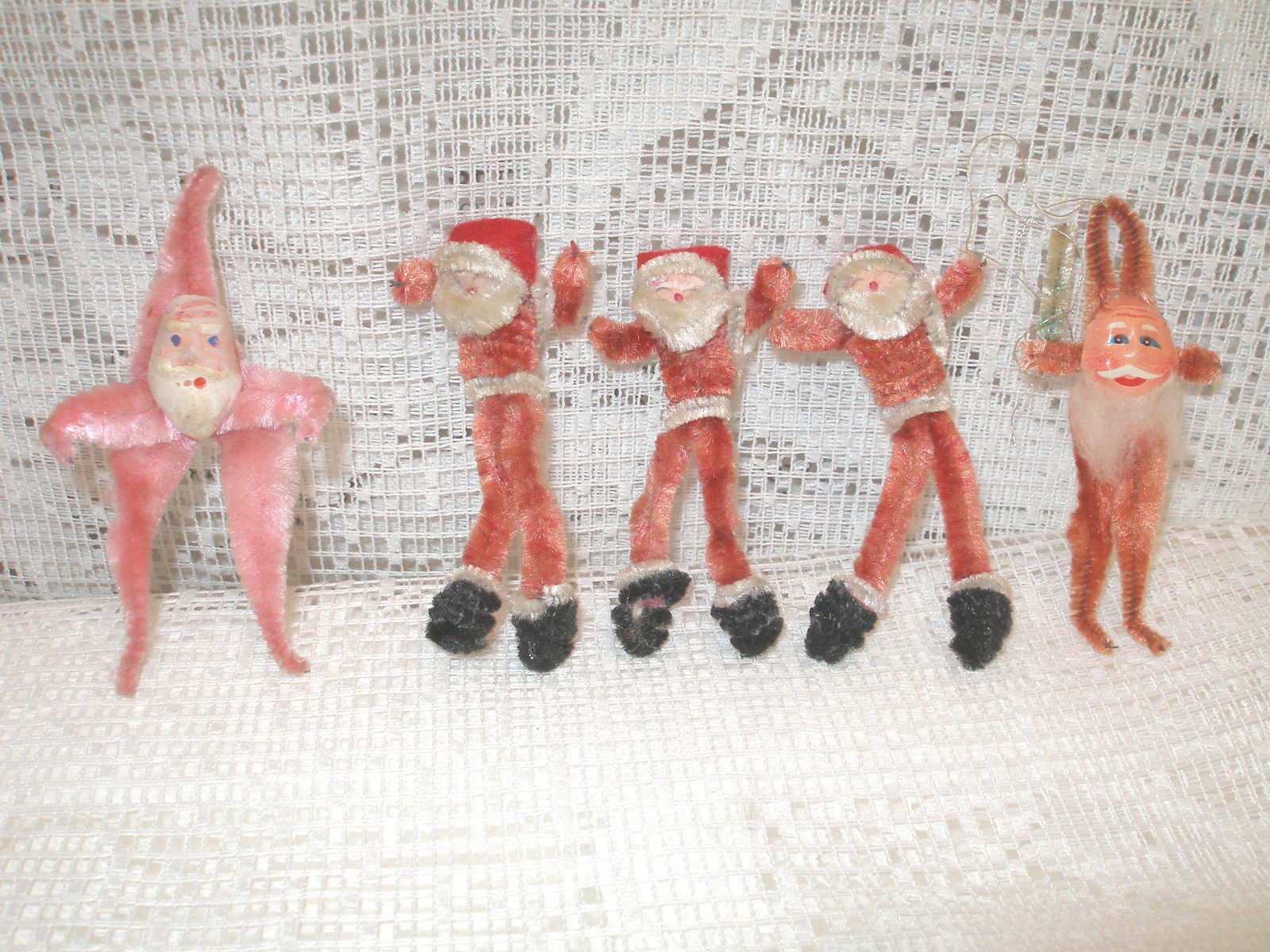 Title (ebay affiliate link): 5 VINTAGE ANTIQUE CHENILLE CLAY FACE TINY CHRISTMAS SANTA ORNAMENTS