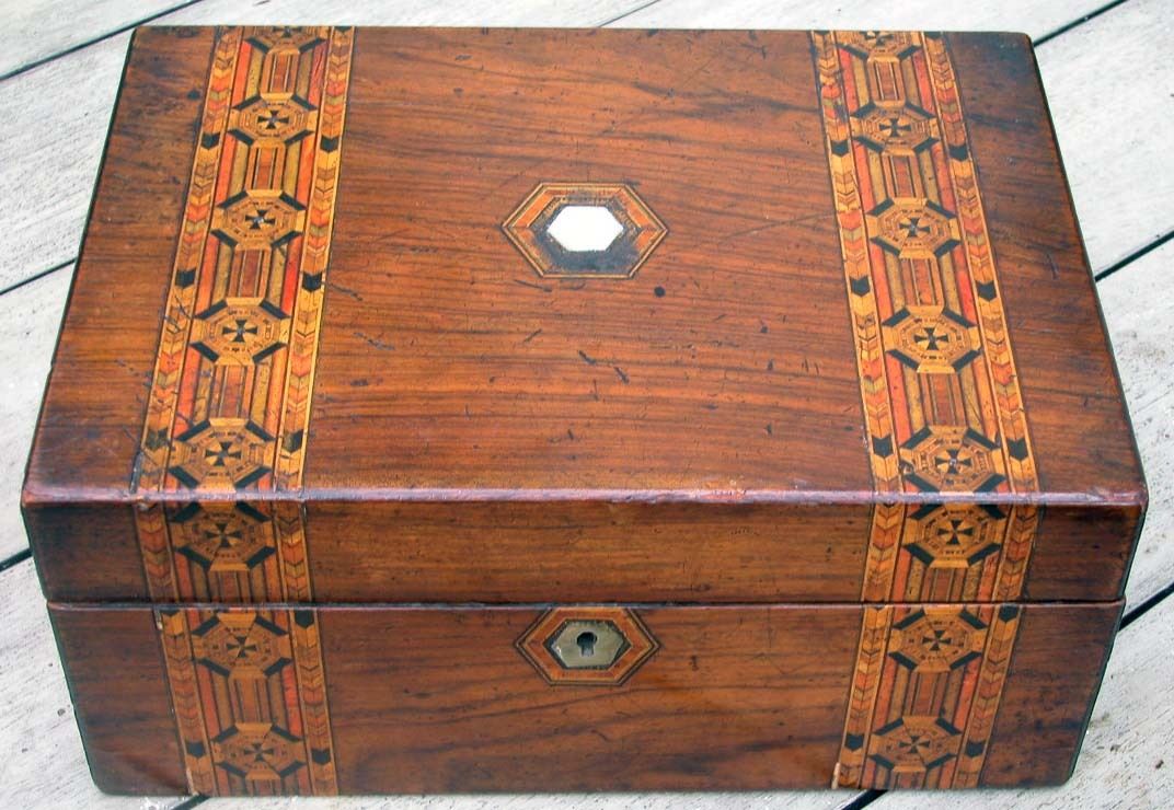 Title (ebay affiliate link): Antique 19c English Tunbridge Ware Lap Desk Tessellated Mosaic Inlay MOP Walnut