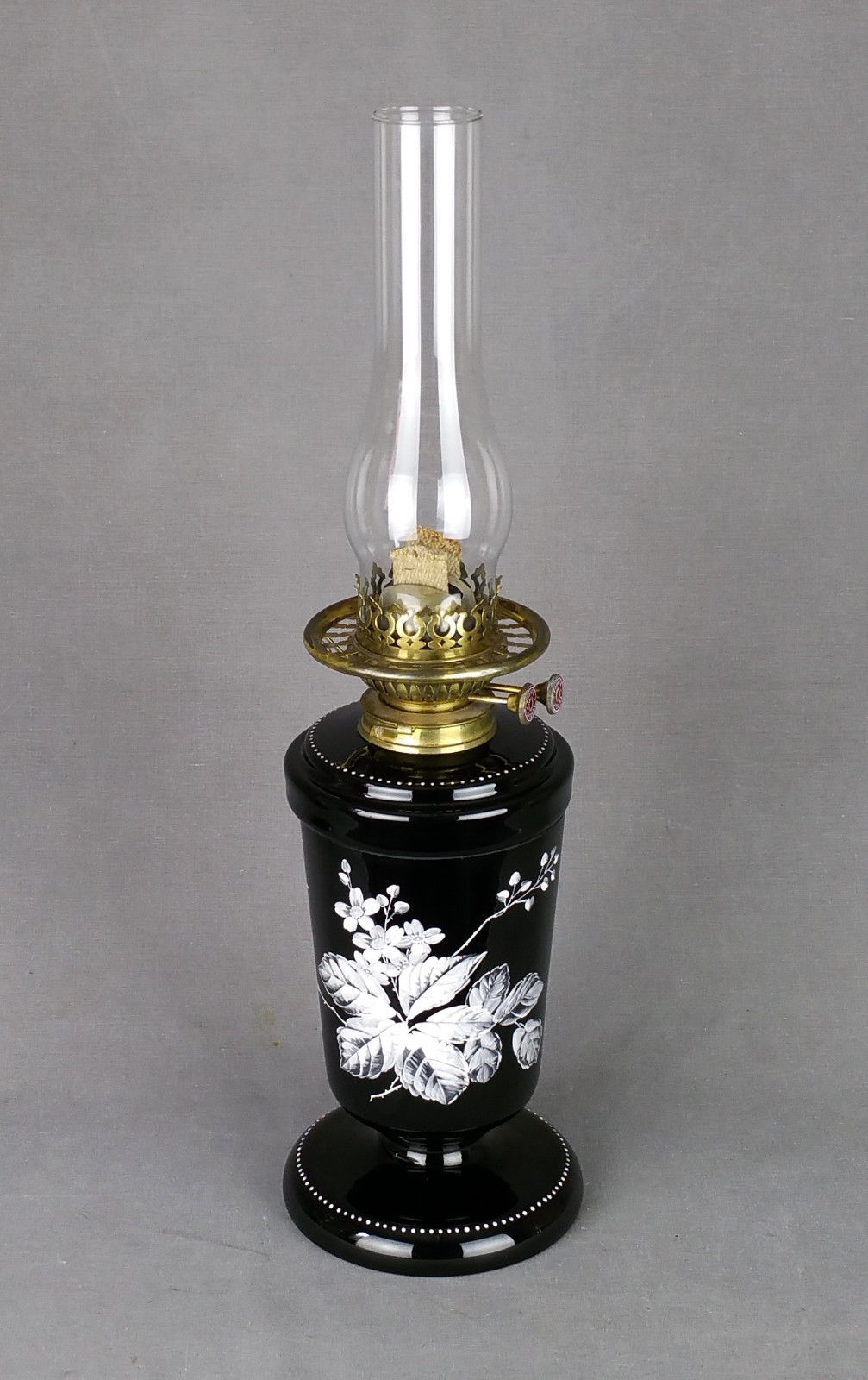 Title (ebay affiliate link): Victorian Mary Gregory Black Glass Kerosene Paraffin Duplex Oil Vase Lamp c1890s