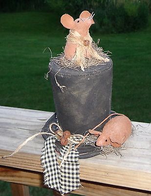 Primitive Snowman Top Hat with 2 Little Mice*Winter Decor*Black Homespun Bow