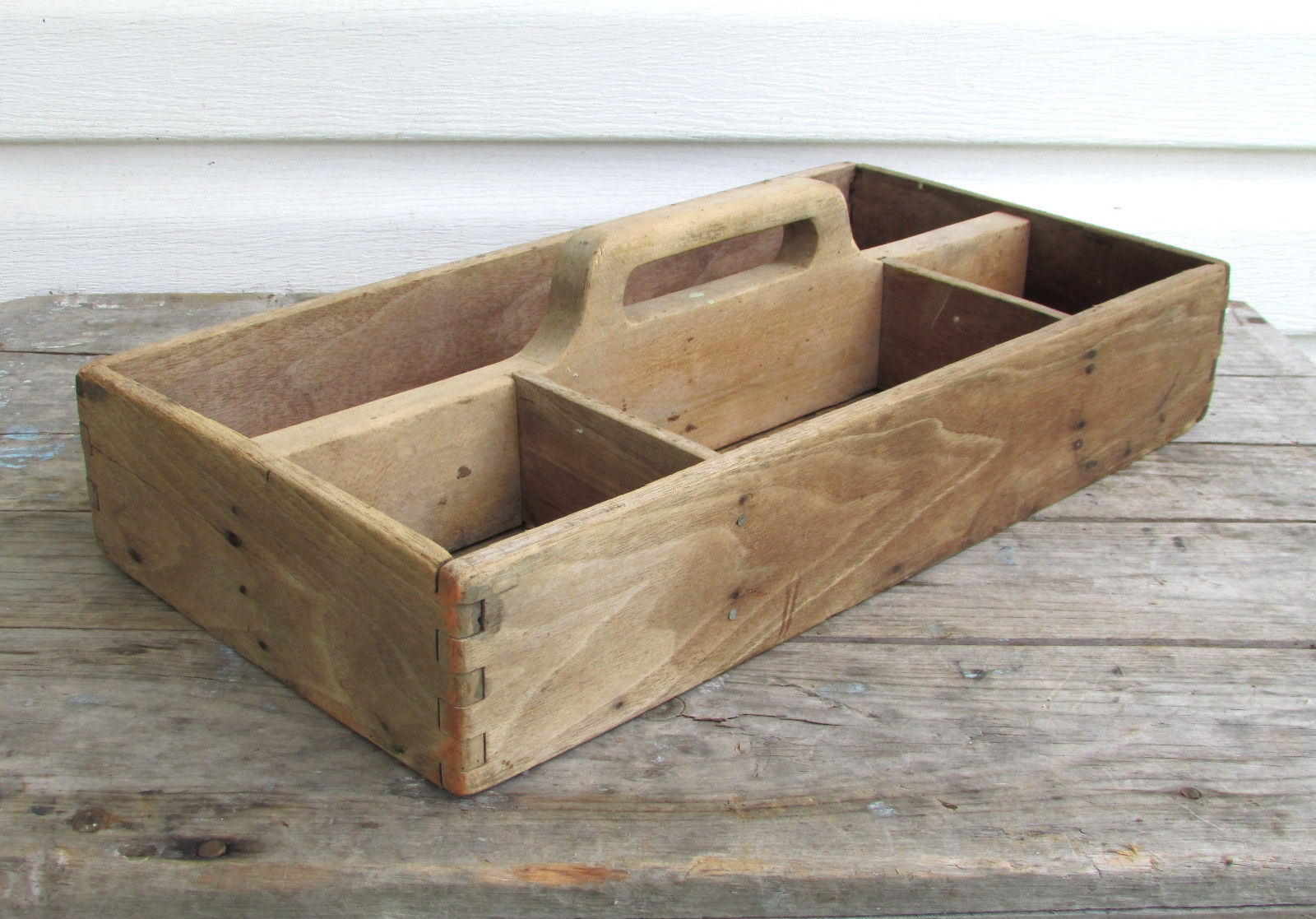 Title (ebay affiliate link): PRIMITIVE WOODEN DOVETAIL TOOL TOTE PAINT DRINK CADDY TABLE DECOR OLD PARTS BIN