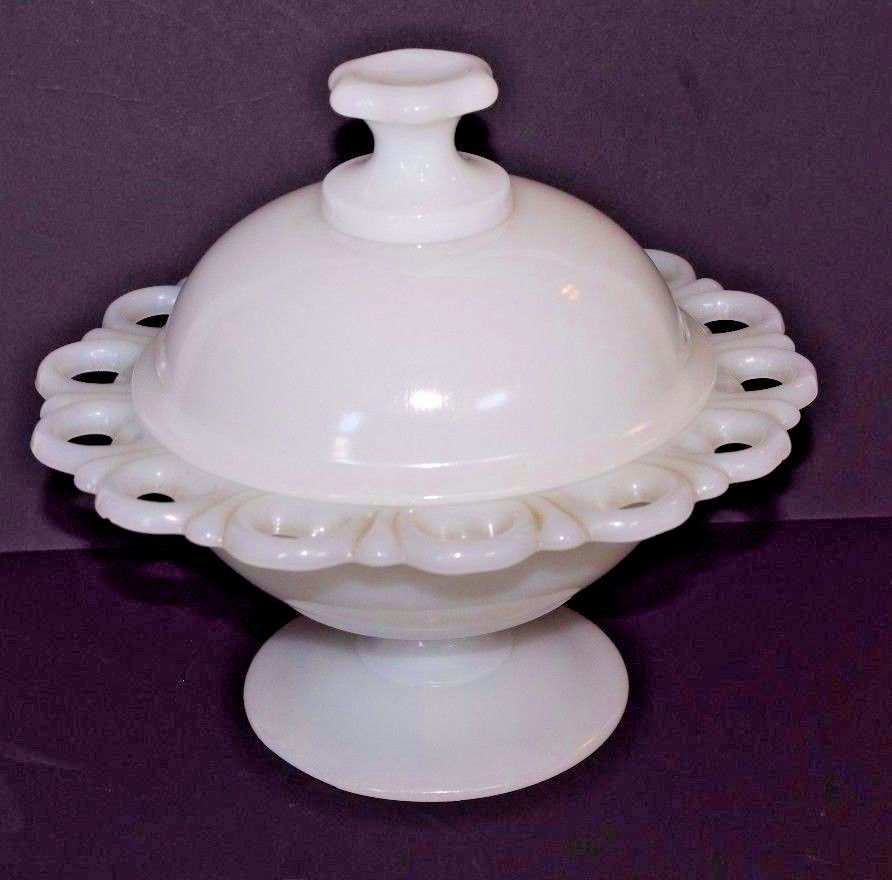 Vintage Milk Glass Candy Dish With Lid (On a small pedastool with lace edge)