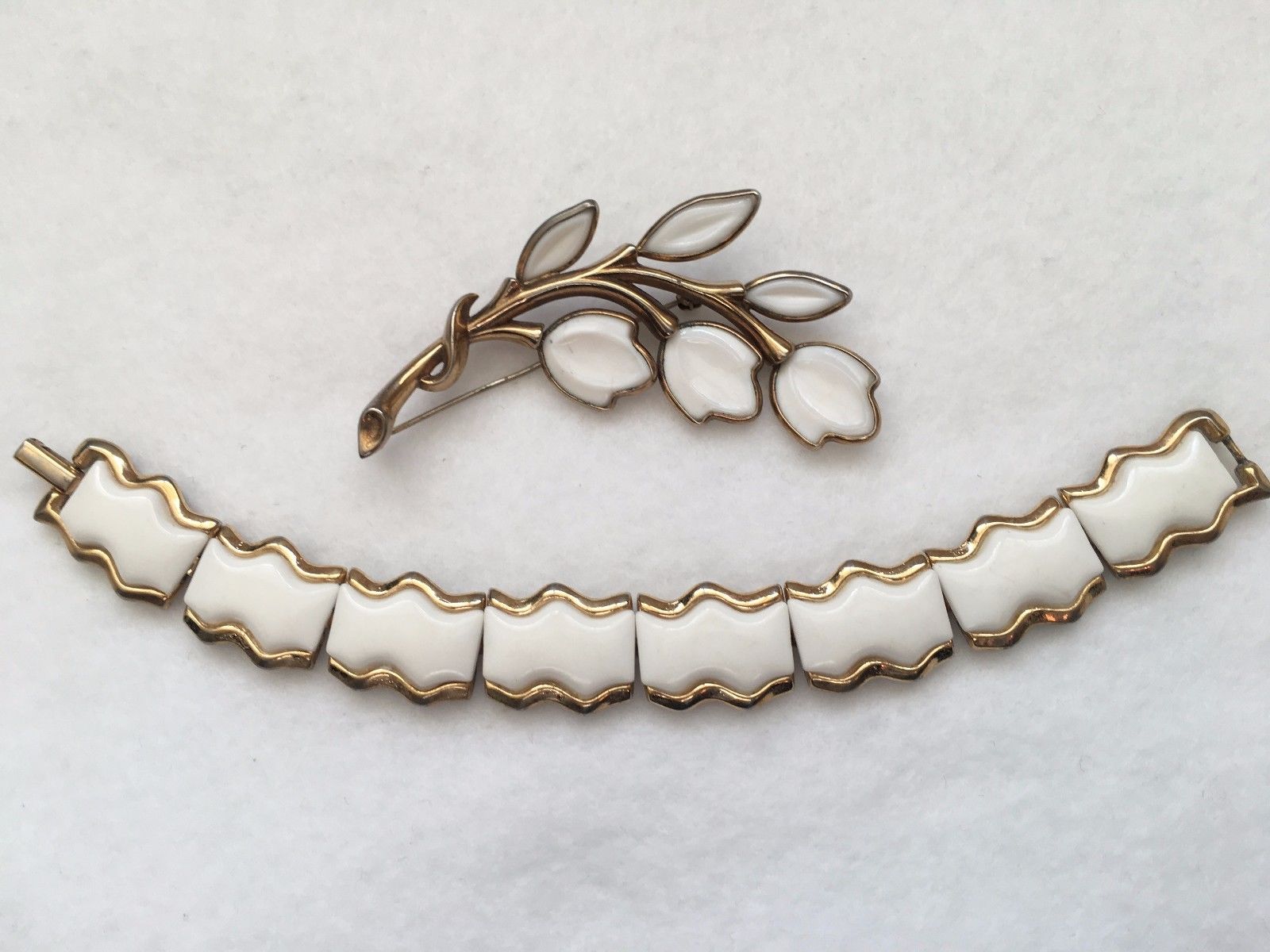 Title (ebay affiliate link): Vintage Crown Trifari White Milk Glass Dogwood Flower Pin Brooch and Bracelet