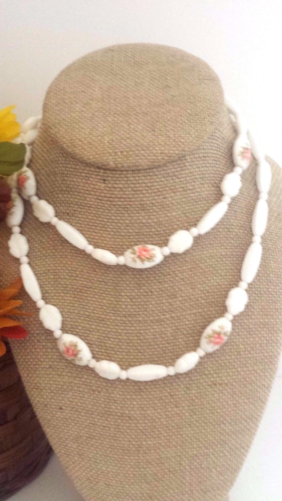 Vintage Necklace Milk Glass Bead''s W/Floral Design 30"