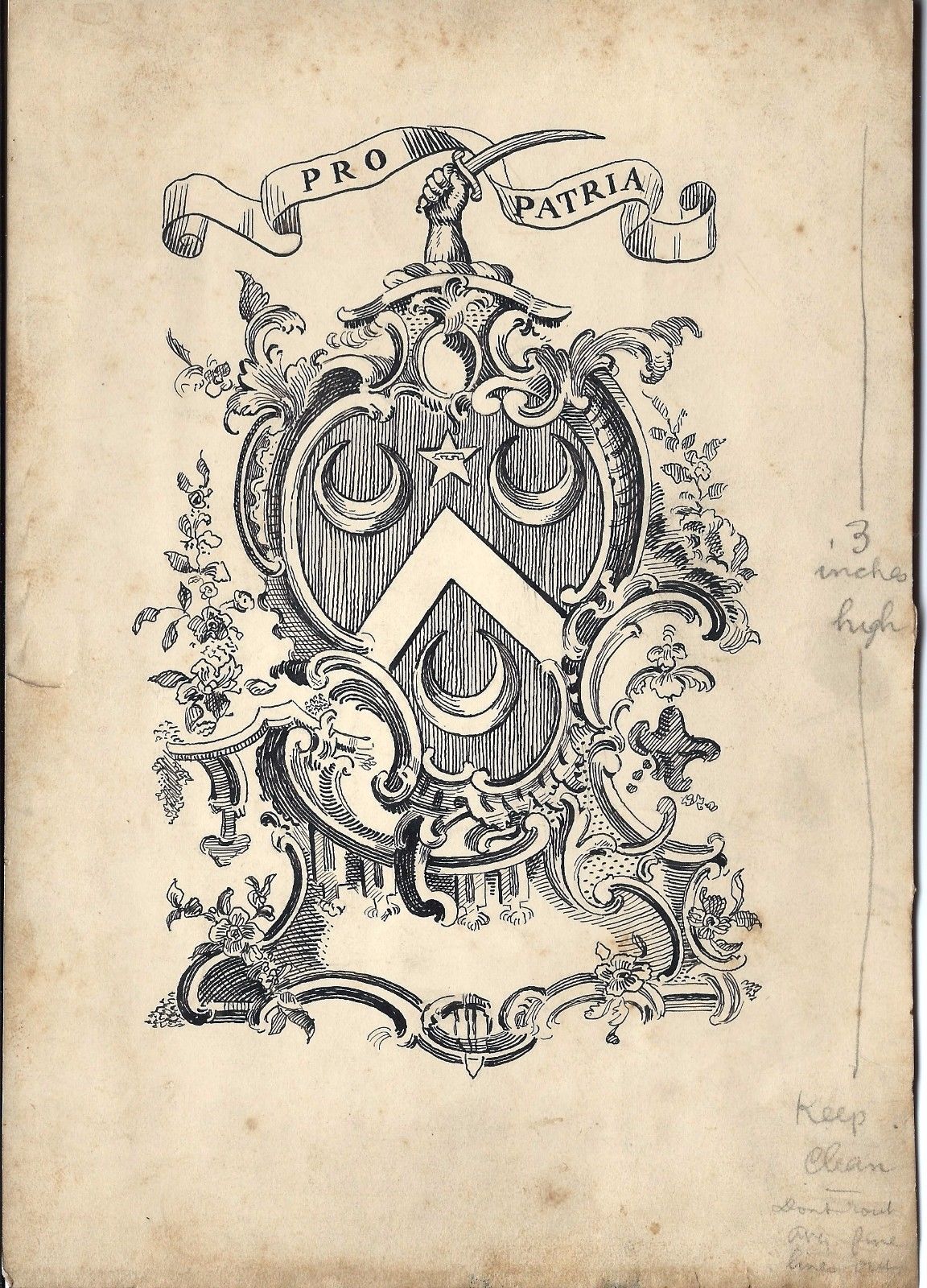 Orig. Art~PRO PATRIA~Vintage ARMORIAL Book Plate~Pen & Ink Design~MARTIN~Chicago