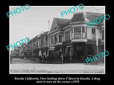 OLD LARGE HISTORIC PHOTO OF EUREKA CALIFORNIA, VIEW OF F STREET, DRUG STORE 1910