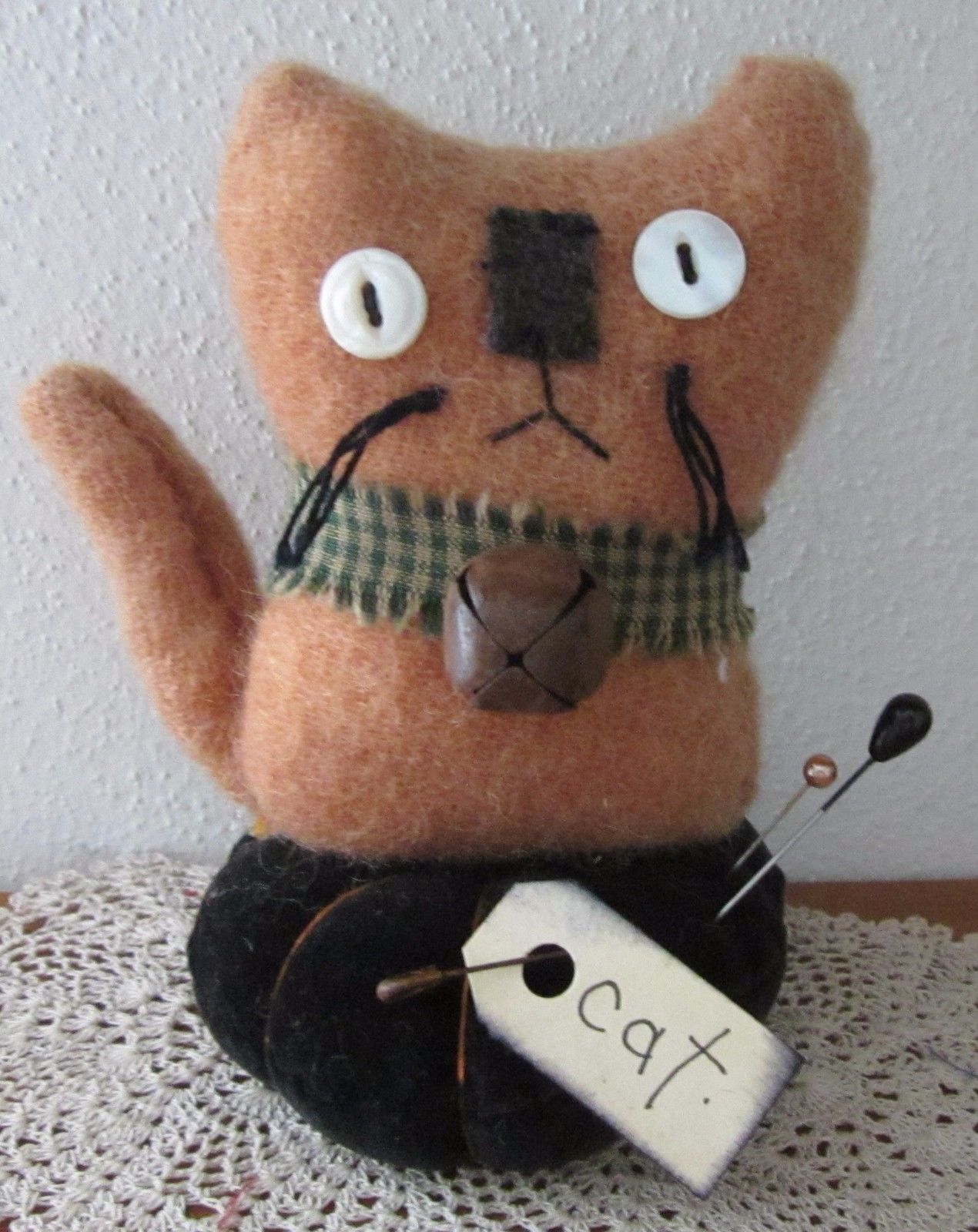 PRIMITIVE WOOL ORANGE CAT HALLOWEEN MAKE DO DOLL PIN CUSHION PFATT EHAG