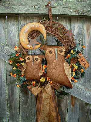 Title (ebay affiliate link): PRIMITIVE FALL~HALLOWEEN~WREATH~MAMMA AND BABY OWLS~MOON~WALL/DOOR HANGER