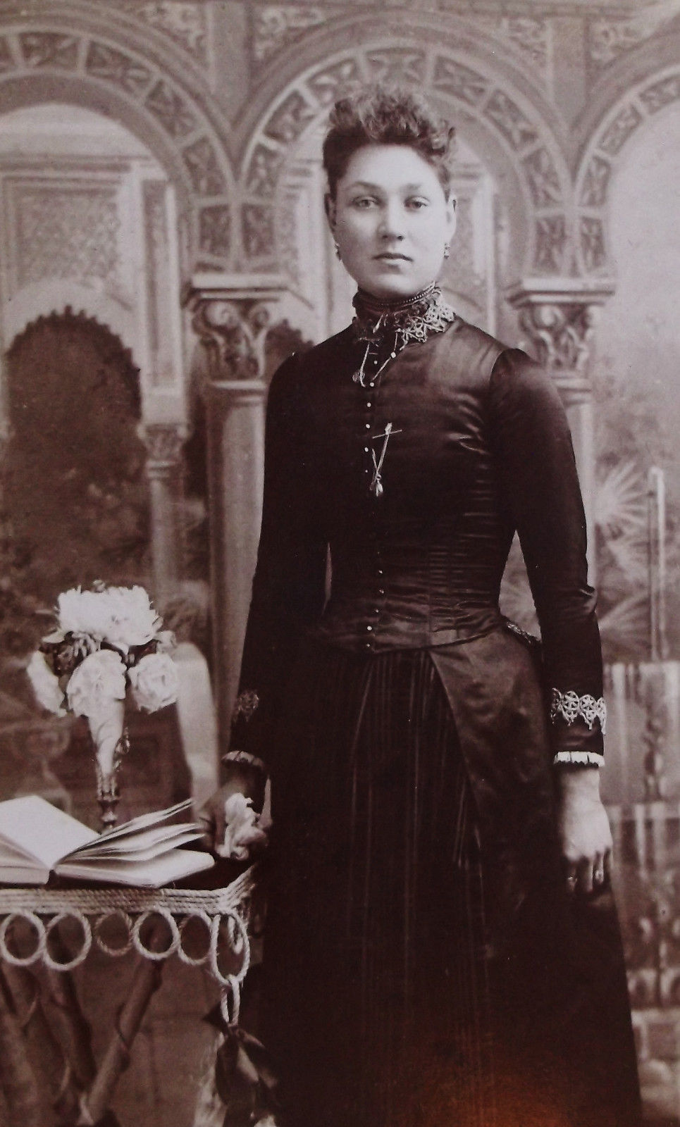 Title (ebay affiliate link): ANTIQUE CABINET PHOTO LOVELY YOUNG WOMAN TROMPE L''OEIL BACKGROUND SHEBOYGAN WISC