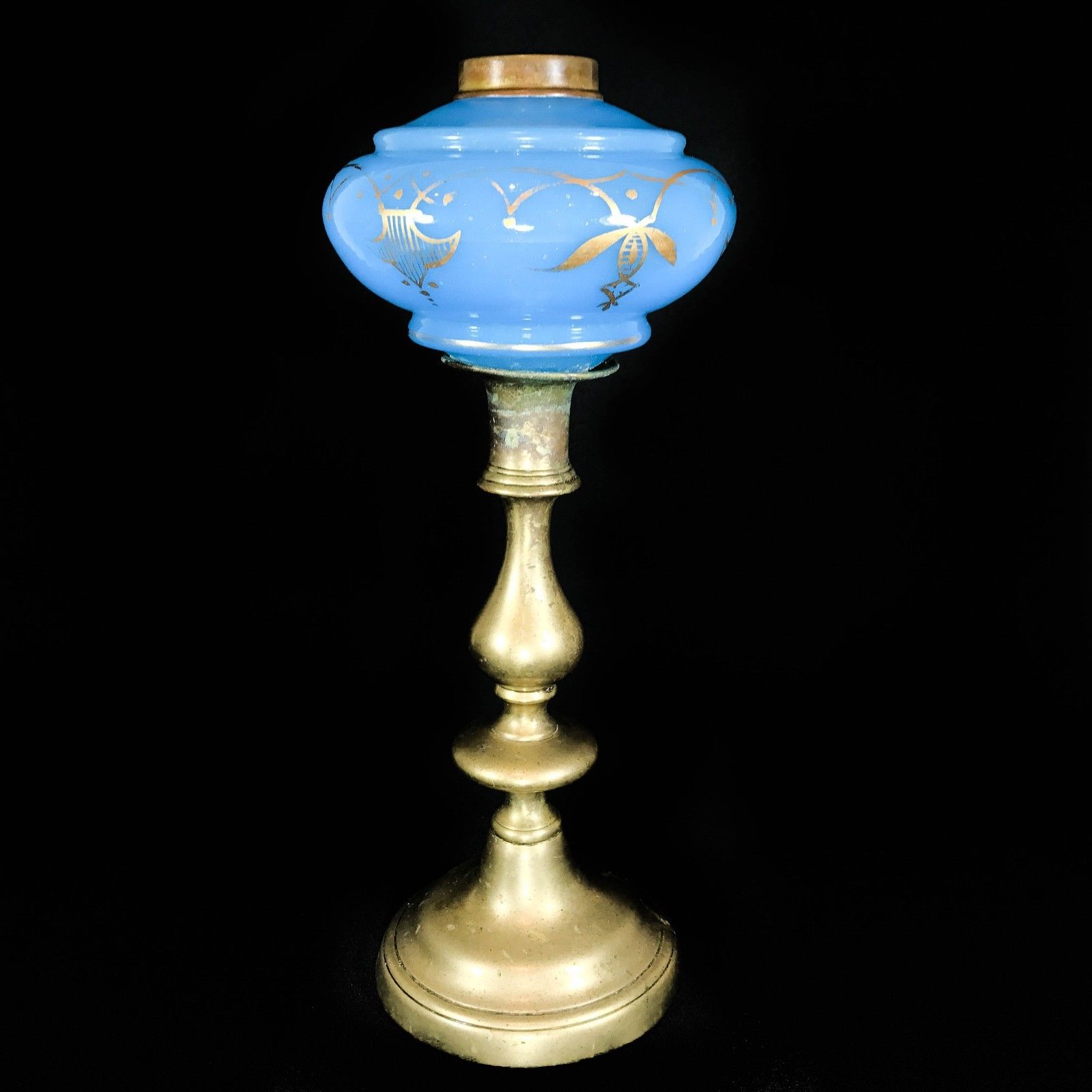 Title (ebay affiliate link): Victorian Antique Brass Oil Lamp With Lovely Blue Residue Glass Shade Retro