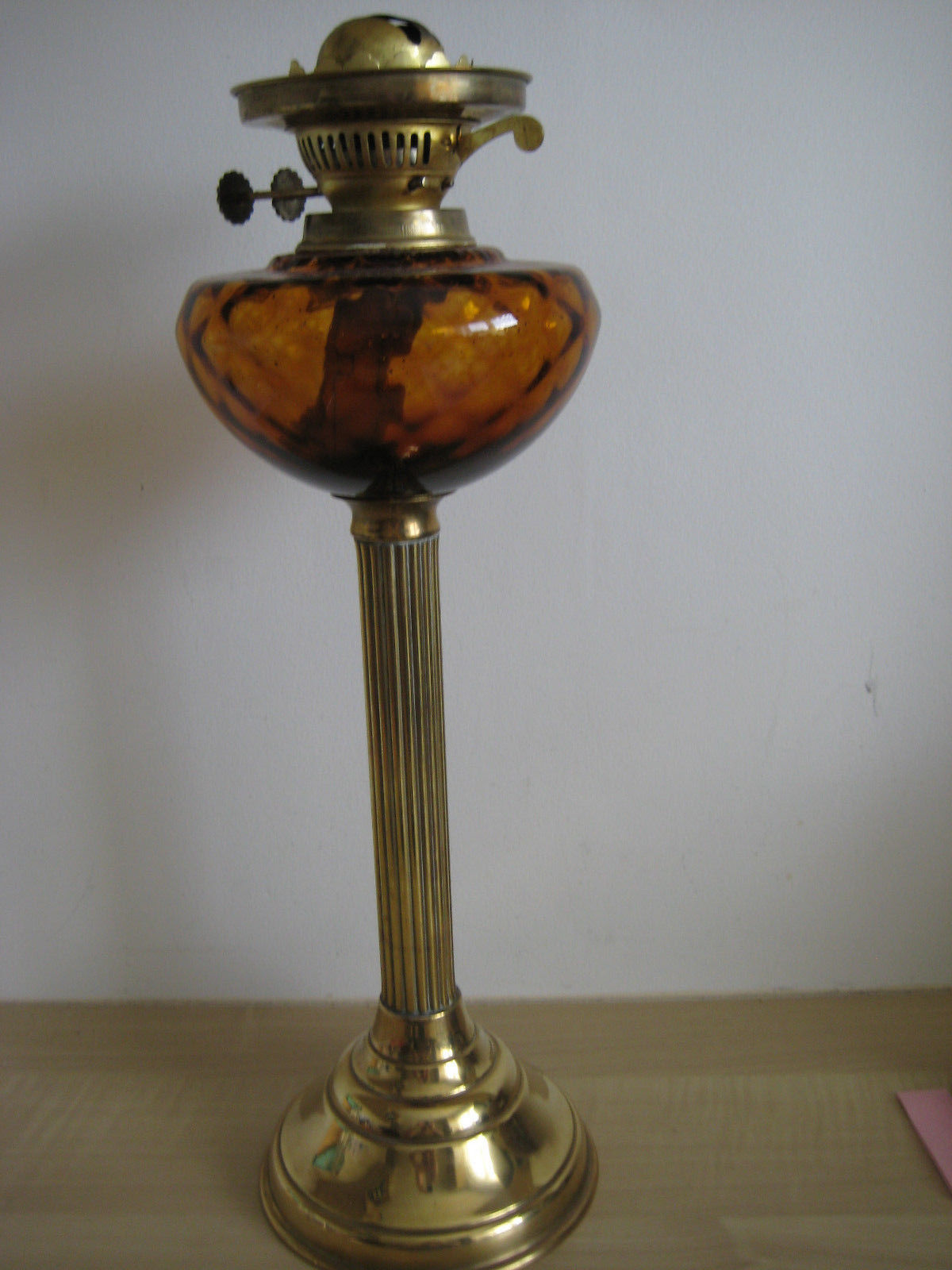 OLD OIL LAMP WITH A LOVLEY 32cm BRASS COLUMN & AMBER WELL