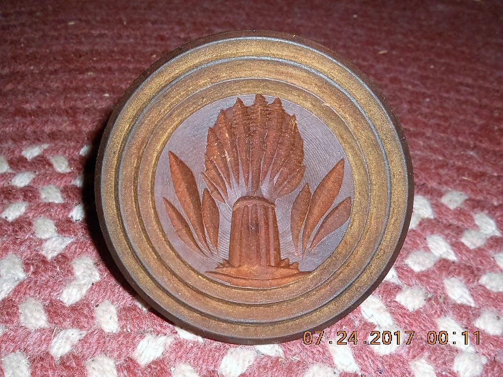 Title (ebay affiliate link): MID 19TH CENTURY WALNUT WOOD BUTTER PRINT W STANDING BUNDLE OF WHEAT NICE TREEN