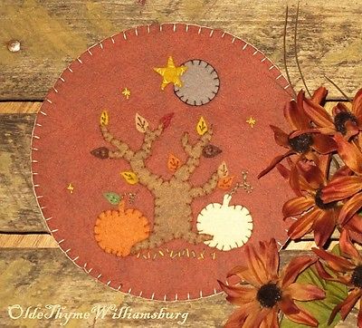 Title (ebay affiliate link): Primitive Stitchery Fall Tree ~ LEAVES~ Pumpkin Wool Felt Penny Rug ~ Candle Mat