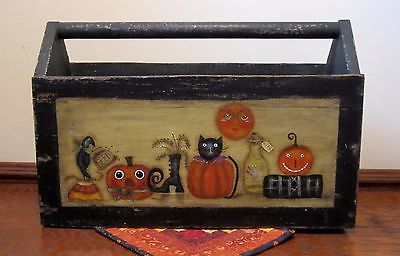 LARGE PRIMITIVE HAND PAINTED WOODEN TOTE ~ HALLOWEEN ~ PUMPKINS ~BLACK CAT~ CROW