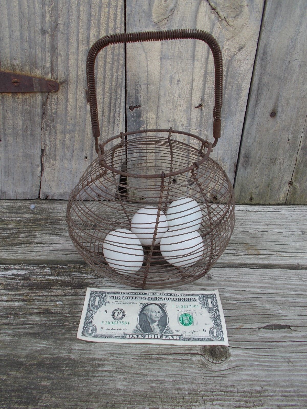 Title (ebay affiliate link): Old Wire Egg Basket and Four Blown Glass Nesting Eggs / AAFA / NR