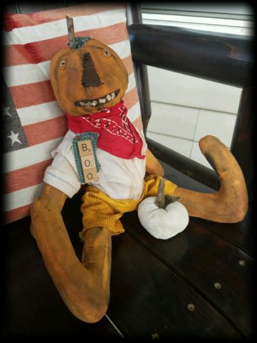 Title (ebay affiliate link): PRIMITIVE Folk Art Pumpkin Doll Halloween Fall White Pumpkin Grungy Scarecrow