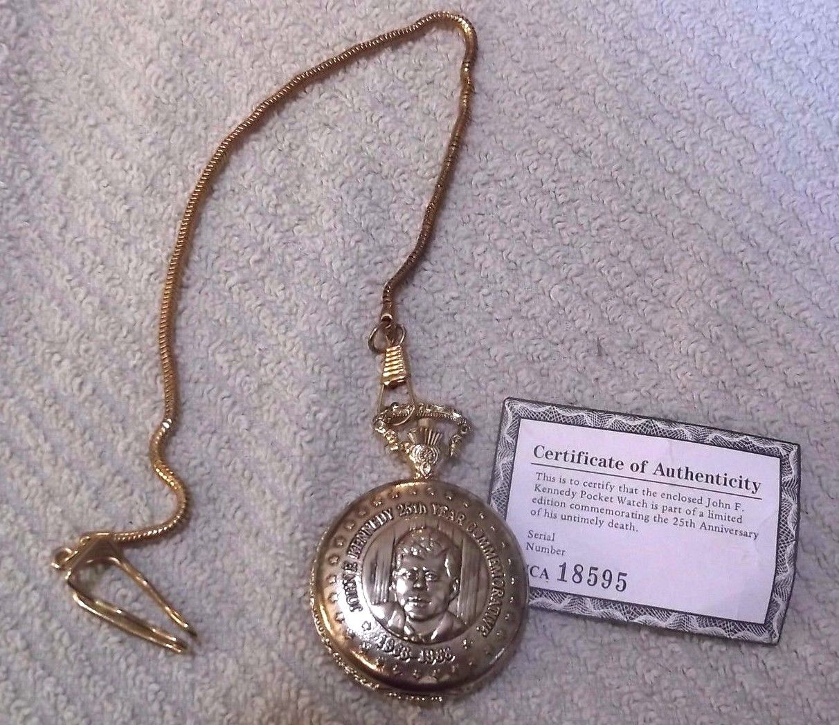 Title (ebay affiliate link): JOHN F. KENNEDY 1963-1988 National Commemorative Pocket Watch With Certificate