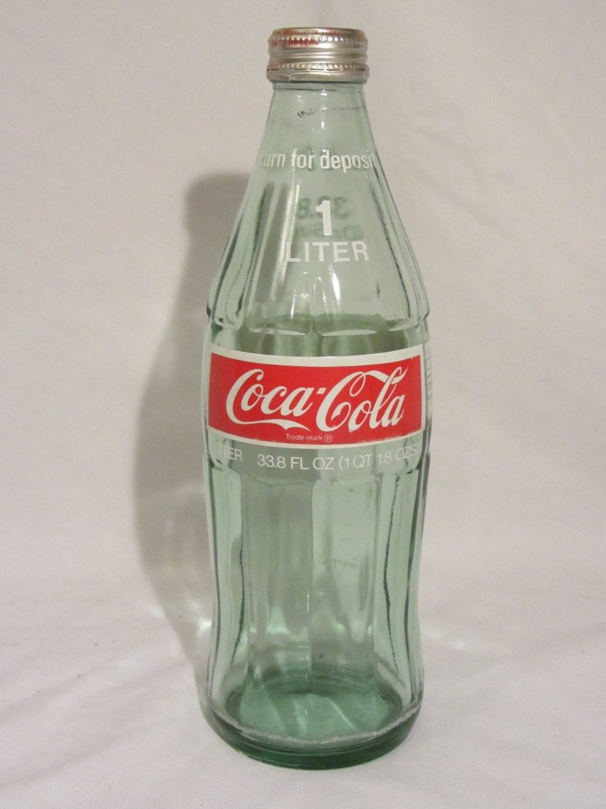Title (ebay affiliate link): Vintage 1977 COCA-COLA COKE 1 Liter (33.8 oz) Size Original Glass Bottle w/ Cap