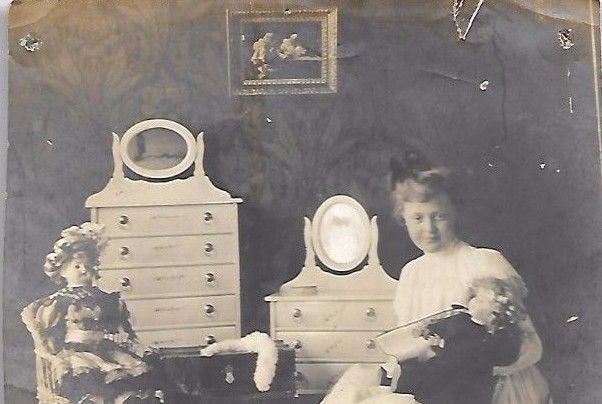 Title (ebay affiliate link): Antique Photo Snapshot of girl with toy German bisque dolls furniture trunk