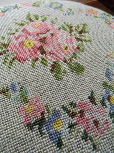 Title (ebay affiliate link): Vintage mahogany wooden low footstool hand worked woolwork top - Pink Roses