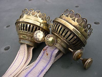 SPARE PAIR OF HEAVY BRASS BRITISH MADE DUPLEX KEROSENE OIL LAMP BURNERS & WICKS
