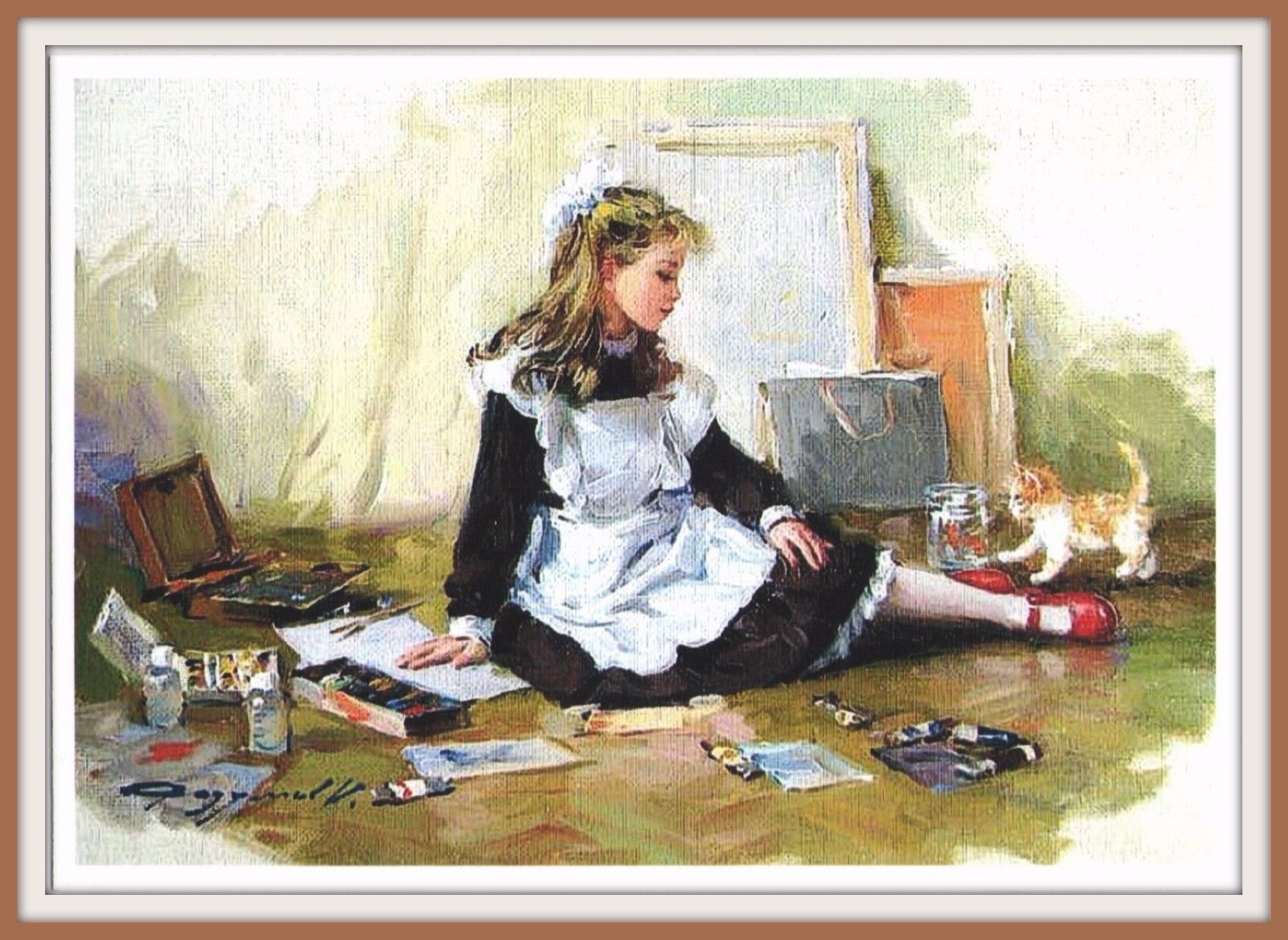 GIRL ARTIST Schoolgirl SCHOOL UNIFORM Red White Kitty Cat Russian Art Postcard