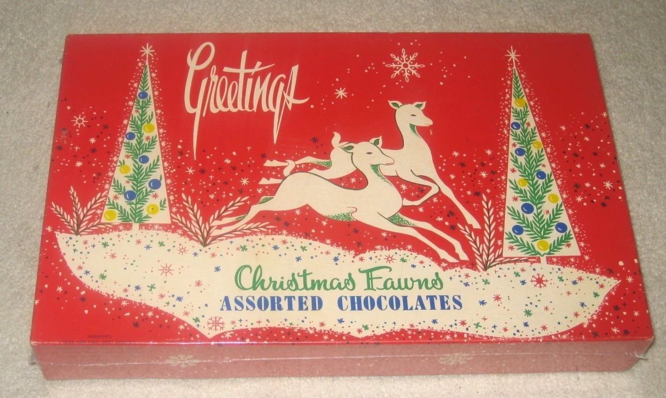 Title (ebay affiliate link): Vintage Empty Cardboard CHRISTMAS GIFT BOXES, Reindeer, Trees, Snow, Chocolate