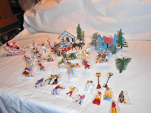Title (ebay affiliate link): Vintage Christmas Lot~2 Putz Paper Houses- Plastic Santa set- 25+ plastic People