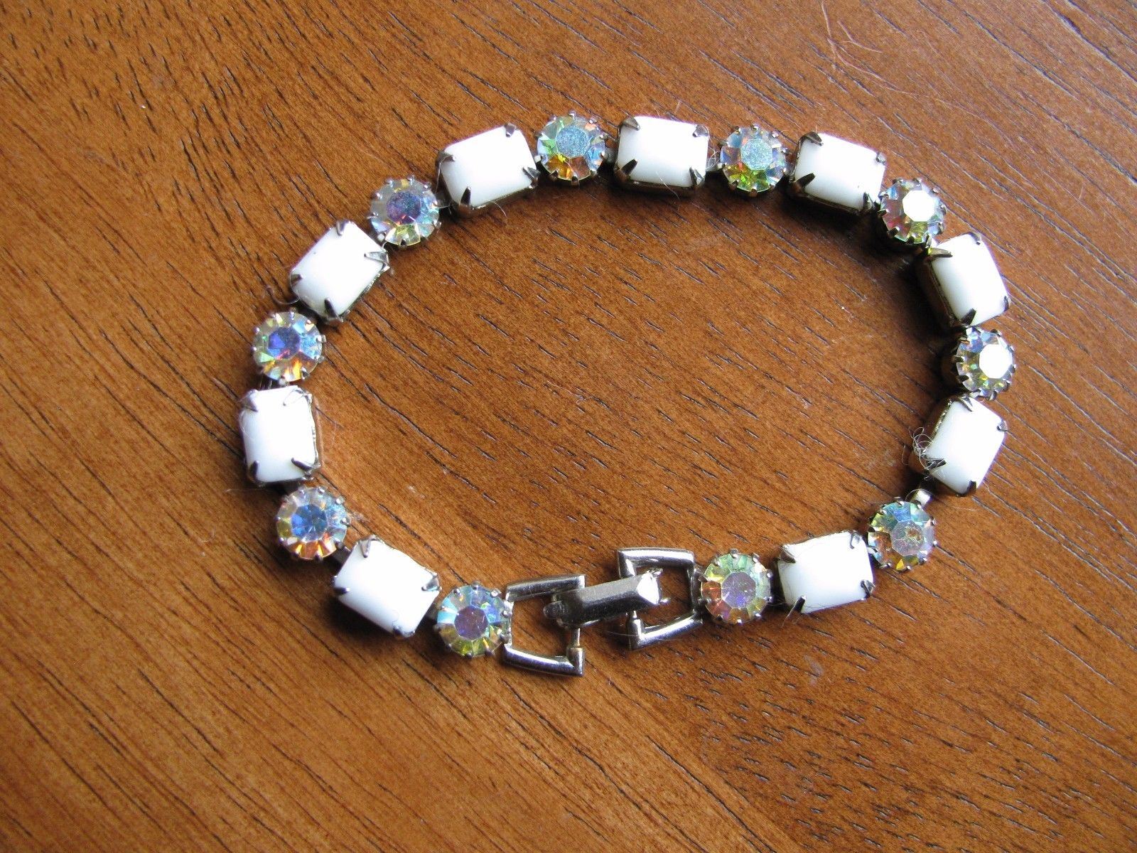 Title (ebay affiliate link): Vintage SPARKLING Signed WEISS White Milk Glass & AB Rhinestone Link Bracelet