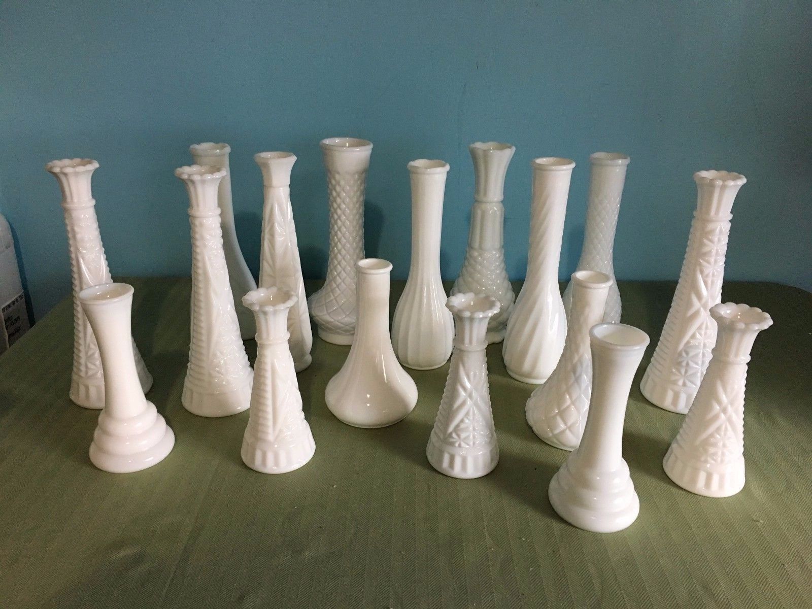 Title (ebay affiliate link): (1) Lot of 17 White Milk Glass Bud Vases 6"-9" Great for Weddings & Showers
