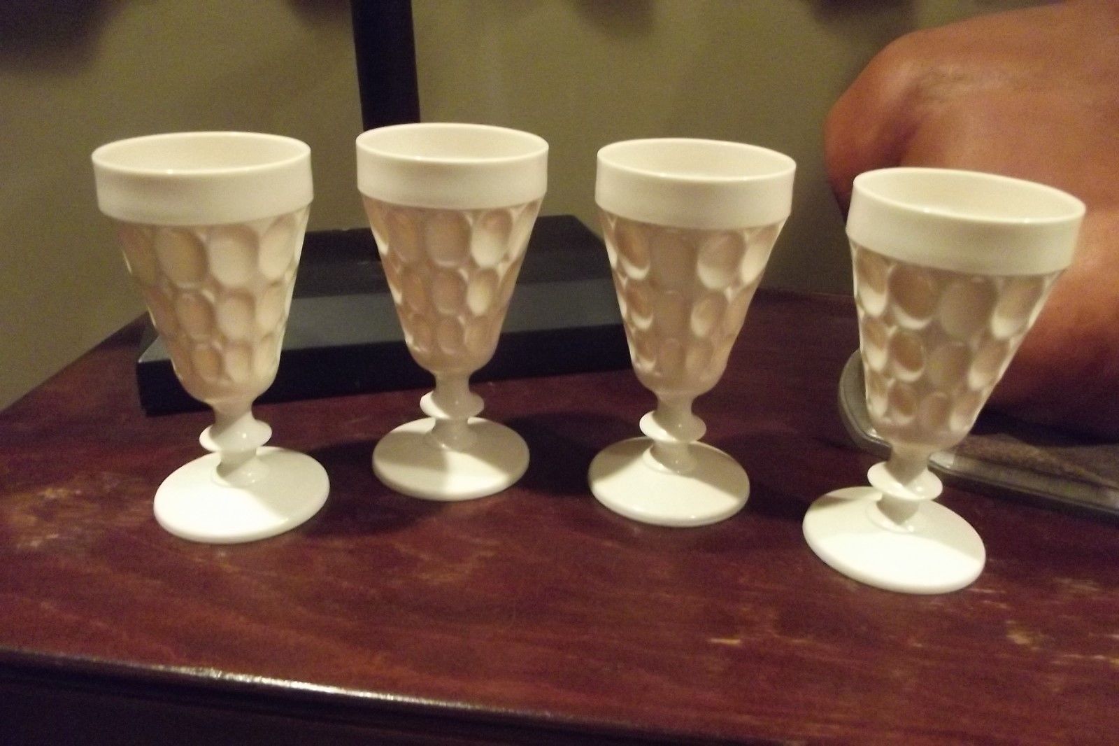 Title (ebay affiliate link): Vintage Set of 4 Jeanette Shell Pink Milk Glass Thumbprint Footed Goblets