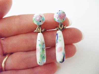 PRETTY VINTAGE WHITE MILK GLASS ART GLASS BEAD DANGLE EARRINGS CLIPS