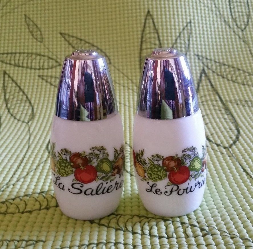 VTG PYREX/GEMCO MILK GLASS~SPICE OF LIFE~SALT SALIERE~& PEPPER POIVRIER SHAKERS