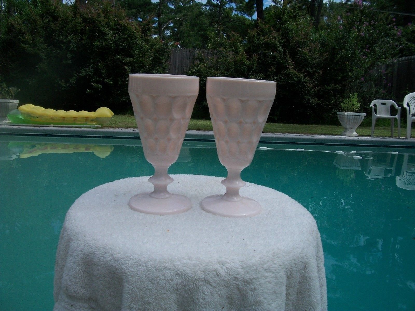 Title (ebay affiliate link): RARE PAIR OF JEANNETTE SHELL PINK MILK GLASS THUMBPRINT FOOTED 6 1/4" GOBLETS