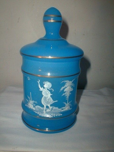 Title (ebay affiliate link): Early Moser? Opaque Blue Mary Gregory Apothecary Jar