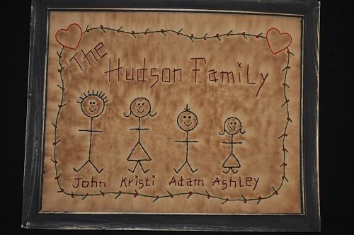 Title (ebay affiliate link): Primitive **PERSONALIZED STICK FAMILY** Stitchery in black frame 12" x 9 1/2"