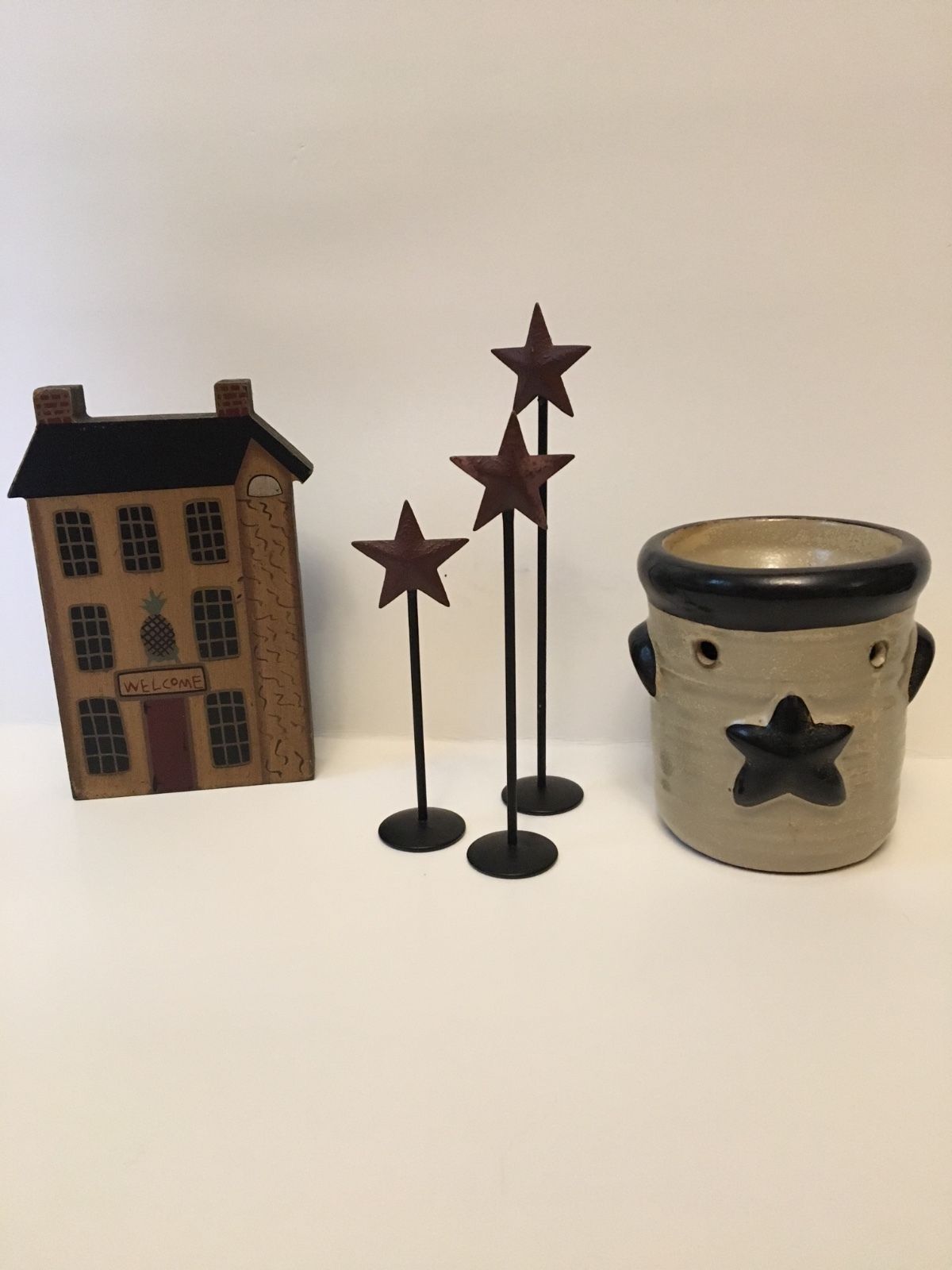 Rustic primitive crock, wooden welcome house, 3 tin stars