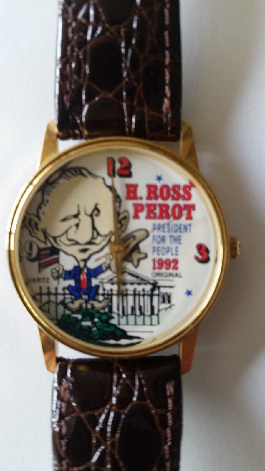 Title (ebay affiliate link): 1992 Ross Perot Presidental watch. Never worn. Lizard leather strap.
