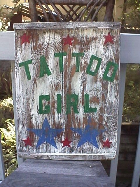 BIG WORN VINTAGE WOODEN CIRCUS OR CARNIVAL SIGN TATTOO GIRL AGE UNKNOWN