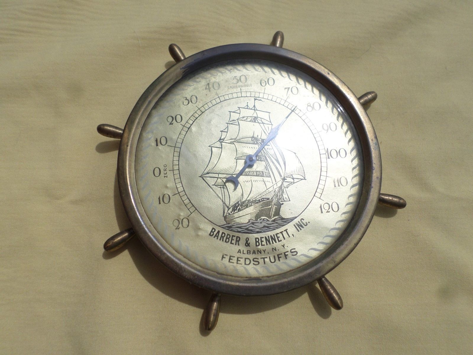 Antique Brass Advertising Thermometer Ship''s Wheel